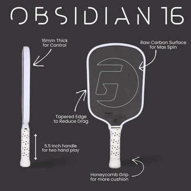 Featuring a thin profile, this paddle offers a generous sweet spot that remains accessible at all times. The thin design provides precise feedback, empowering you to fine-tune your power and effortlessly outplay your opponents, securing your victory. The long handle and sleek grip combination make maneuverability seamless, granting you excellent reach, control, and responsiveness. Whether you’re playing singles or doubles, the Gamma Obsidian Pickleball Paddle keeps your adversaries guessing your next move, perfectly complementing your strategic style. Embrace opportunity and strategy with this paddle that is designed to elevate your game. 16mm paddle thickness.